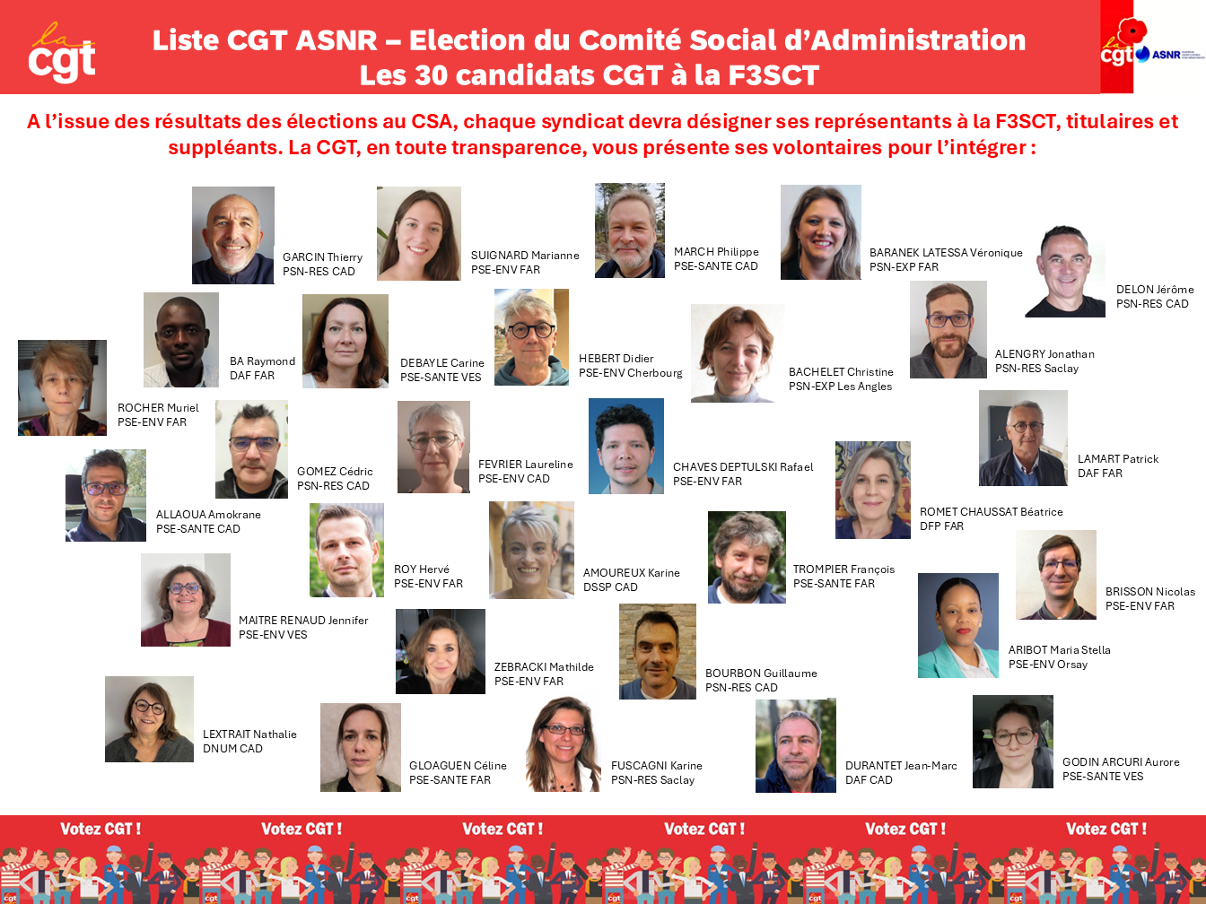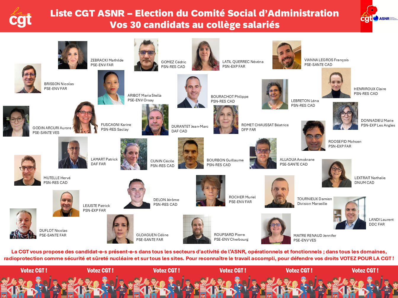Dans un contexte inédit où le statut des salariés doit pouvoir être défendu au sein d’une AAI, votre choix sera déterminant pour la représentativité syndicale : en votant pour nos candidats, vous donnerez du poids à la CGT pour peser dans les négociations et les consultations sur les projets présentés par la direction de l’ASNR. Les élus CGT, forts d’une détermination et d’une expérience que vous avez pu constater tout au long de leurs précédents mandats s’engageront de nouveau à défendre vos droits et à se battre pour l’amélioration de vos conditions de travail.